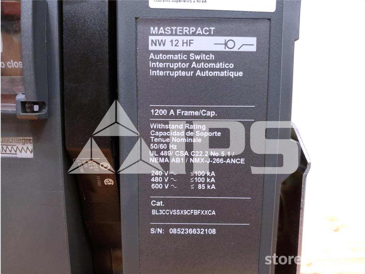 1200A SQD MASTERPACT NW12 HF EO/BI BL3CCVSSX9CFBFXXCA UNUSED SURPLUS 120VAC CONTROL, 24VDC TRIP, AUTOMATIC SWITCH INSTANTANEOUS, 1200A AMPACITY
