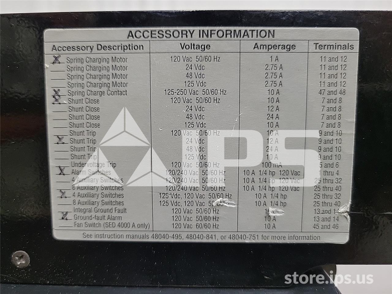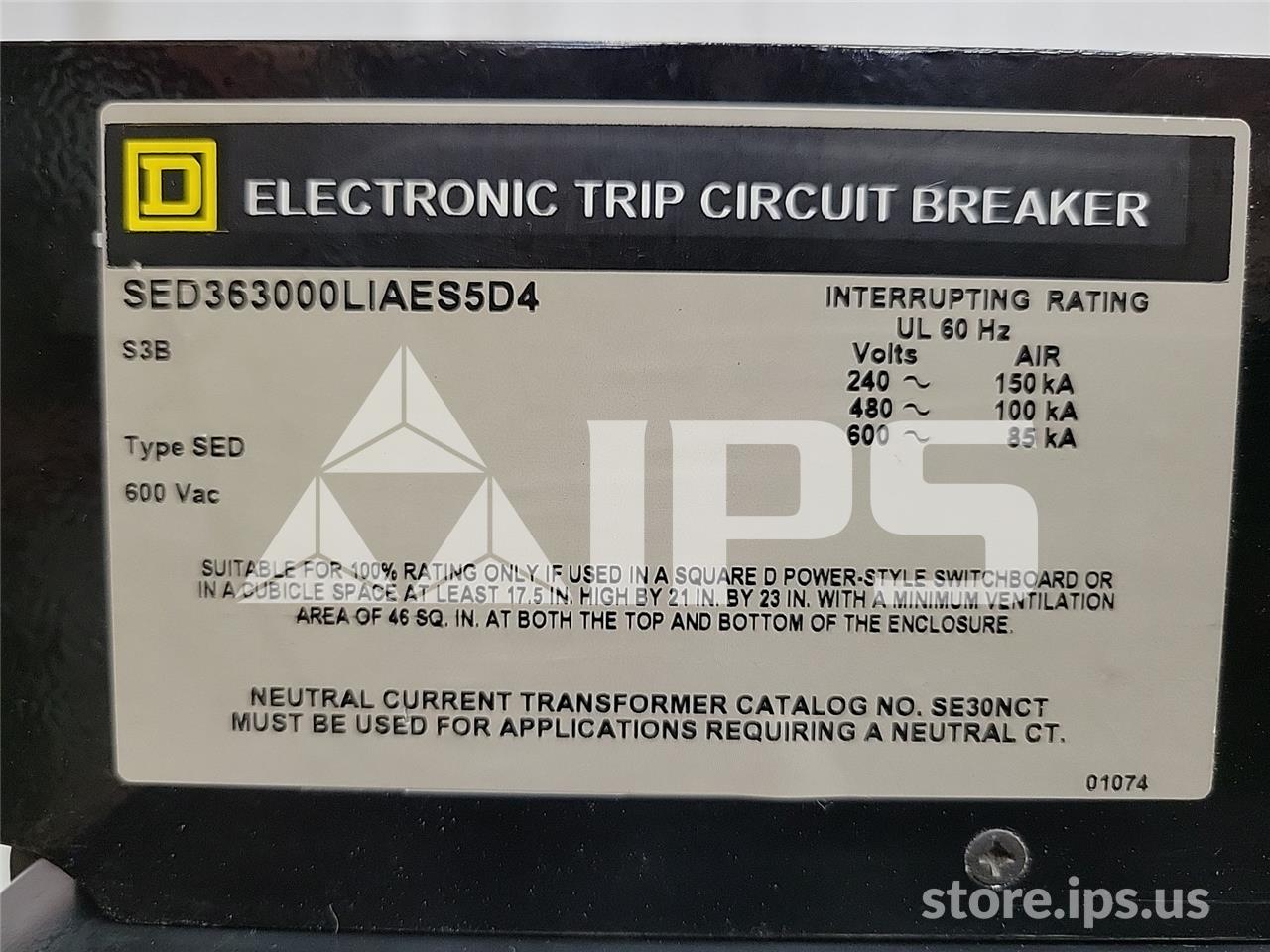 3000A SQD SED363000LIAES5D4 EO/DO (SED363000) 120VAC CONTROL, 24VDC SHUNT TRIP, MICROLOGIC SERIES B LIA, 3000A CT, ARP100 RP