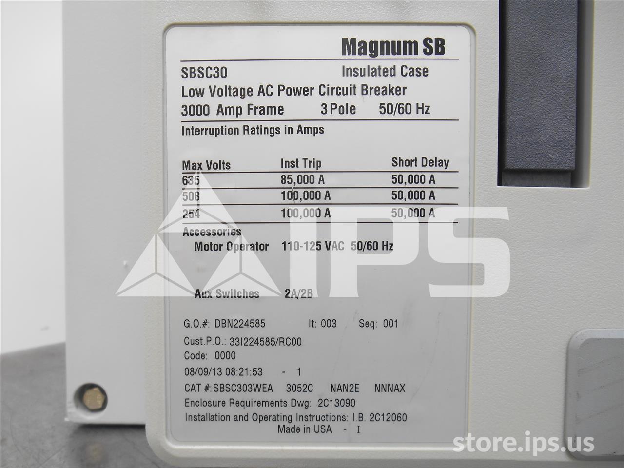 3000A CH MAGNUM SBSC303HEA30CMAMNN4ENNNFX MO/BI UNUSED SURPLUS (SBSC30) 120VAC TRIP, DIGITRIP 520 LSI, 3000A RP, 3000A CT